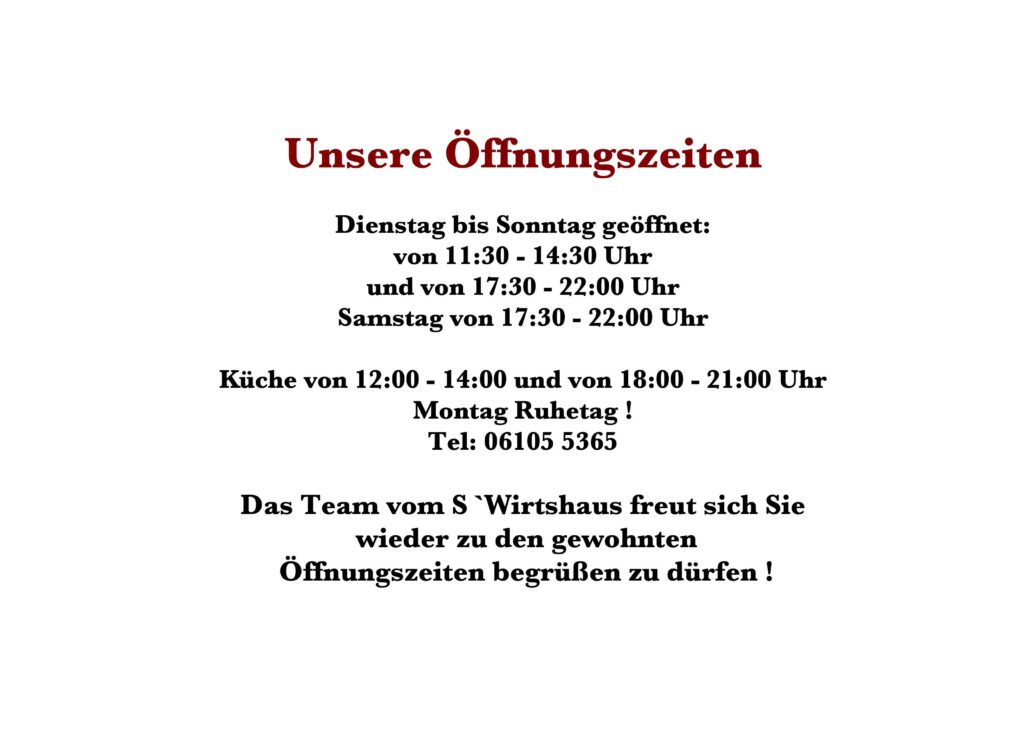 ! Küche geöffnet : Di. - Son. 12:00 - 14:00 Uhr 18:00 - 21:00 Uhr Sa. . 18:00 - 21:00 Uhr Tel. 06105 5365