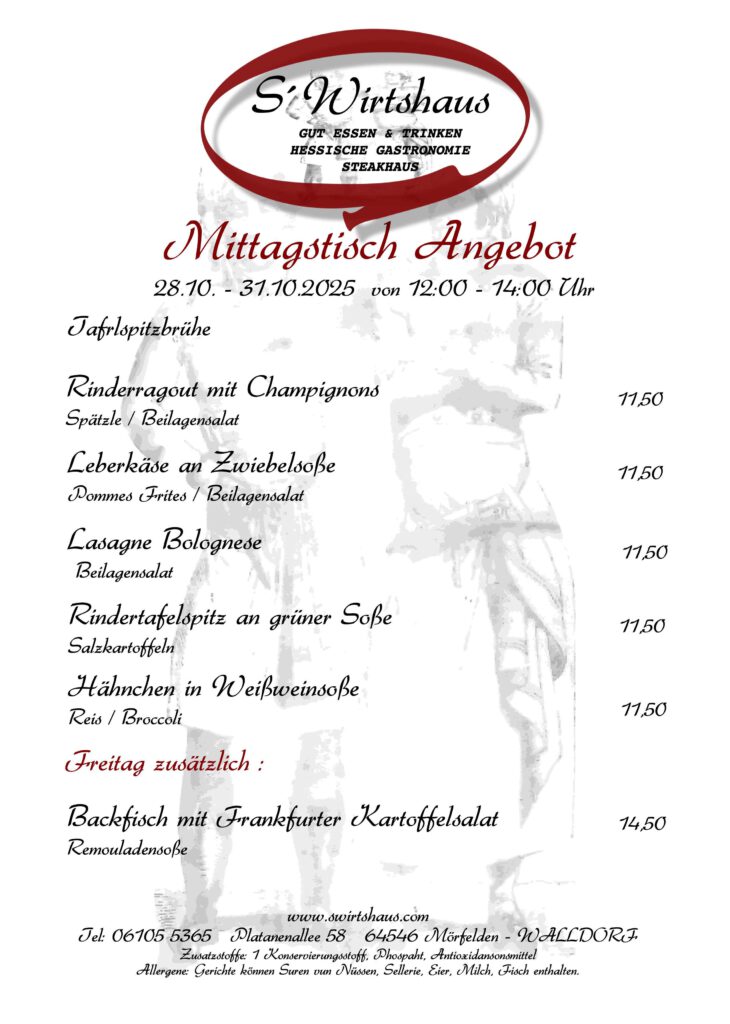 ! Küche geöffnet : Di. - Son. 12:00 - 14:00 Uhr 18:00 - 21:00 Uhr Sa. . 18:00 - 21:00 Uhr Tel. 06105 5365